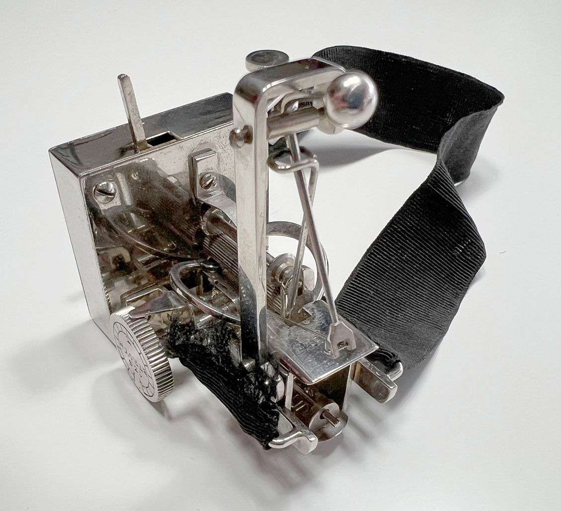 El médico y homeópata inglés Robert Ellis Dudgeon (1820-1904) presentó este nuevo esfigmógrafo pequeño y portátil en 1881. Se sujetaba con una correa a la muñeca. El movimiento se transmitía a una aguja que registraba las curvas en papel ahumado. Éste se desplaza por un mecanismo de reloj.