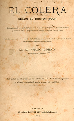 El cólera según el doctor Koch. Se trata de la conferencia que dio Robert Koch en el Consejo Imperial de Sanidad de Berlín y discusión habida a propósito de sus trabajos en Egipto, India y Tolón. La traducción corrió a cargo de los doctores Garín y Navarro. Está anotada y prologada por Amalio Gimeno, Valencia, por Pascual Aguilar 1884 . (Biblioteca y Museo Historicomédico. Valencia. Universitat de València). |